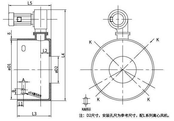 该风机主要用于电机为双出轴方式,后端不能加装轴流式风机,采用离心风机冷却,离心风机采用L系列、右旋、立式。机壳采用钢板焊接而成,配有进风导流口,可根据客户要求选配进风口无纺布空气过滤器。