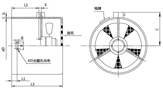 此系列风机主要用于铝壳电机的强制冷却,但电机可分为带尾轴和不带尾轴,风机尺寸将会做相应调整,安装孔为4孔十字均布。